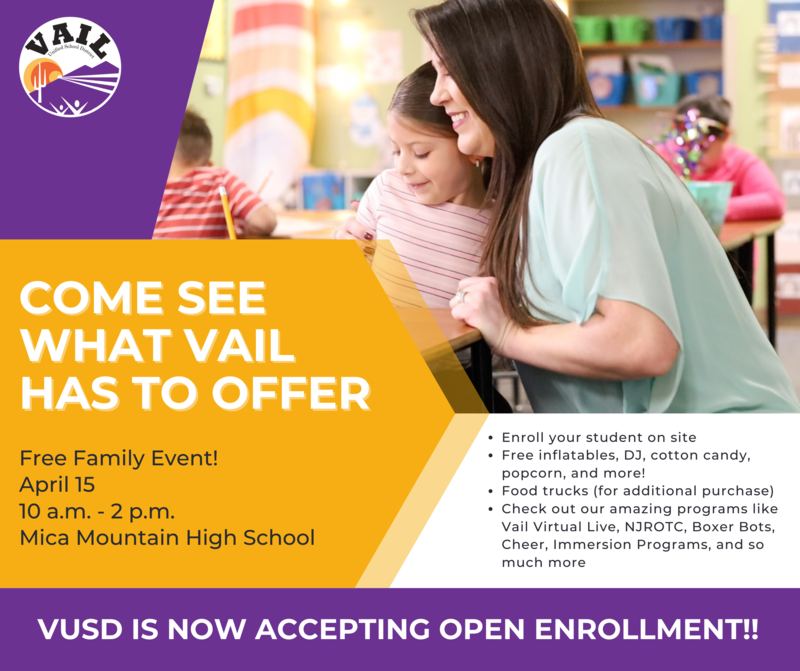 The Vail School District welcomes you to an award winning school district of choice! Vail has been recognized locally, statewide, nationally, and even internationally for its outstanding educational programs, staff, and culture. And, Vail is now accepting open enrollment families.
